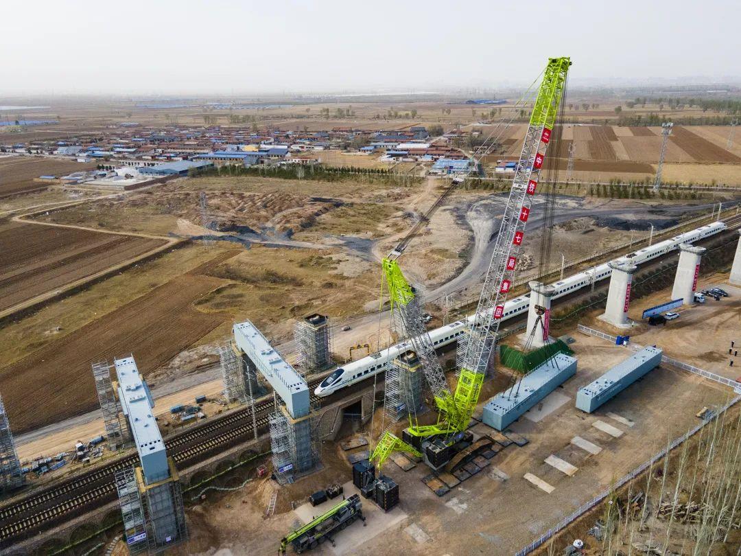 △列车驶过冯村跨韩原铁路特大桥施工现场(图片来源:中国铁建)
