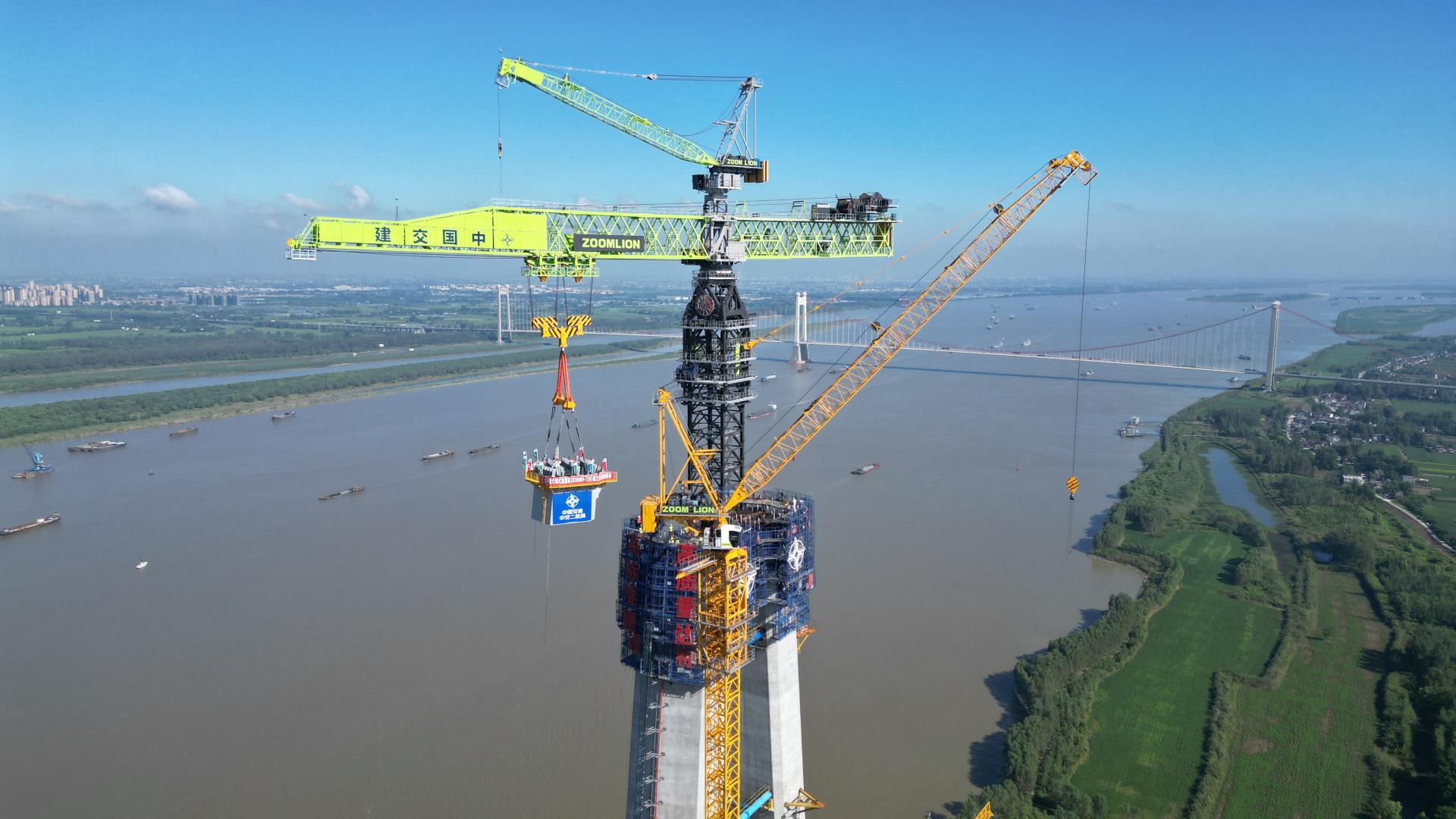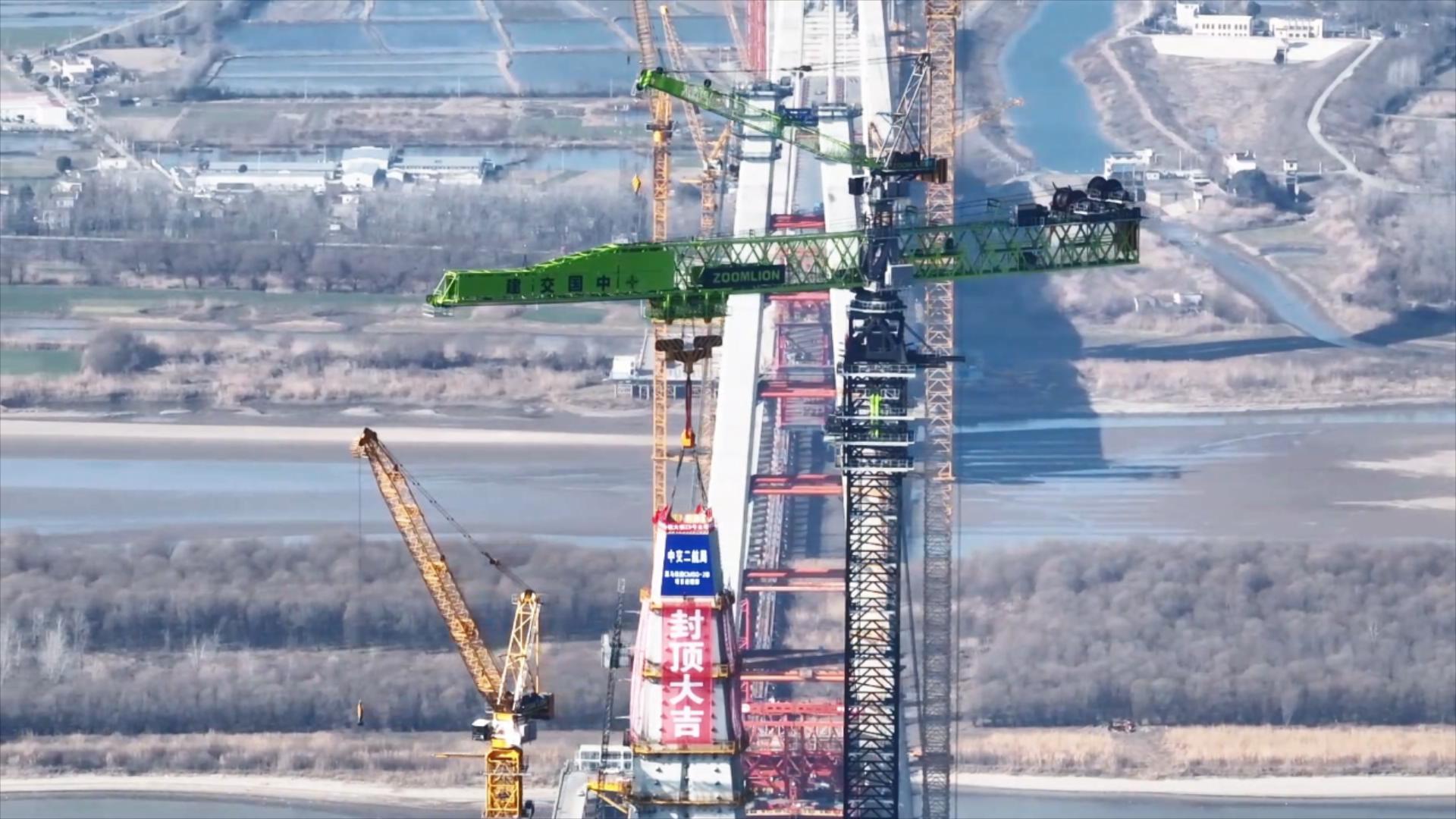 ▲中联重科全球**大塔机完成马鞍山长江公铁大桥南主塔封顶吊装