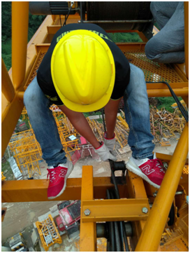 ▲小分队成员与塔机师傅交谈,仔细检查设备的每个环节 红桃视频高清.
